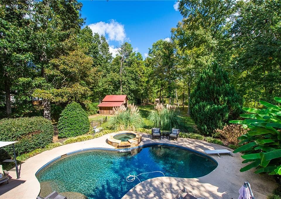 Looking for a cabin on a lake? This impossible home to find offers a rustic environment with farmhouse design. From the moment you drive on to this 2.25 acre property you will be impressed with the privacy it offers. You will park beside the 3 car detached garage with additional storage and look left and see the most charming cabin with a welcoming front porch. Step inside to soaring ceilings, rustic stone floors, warm hardwood wood plank flooring and you will feel transported to a mountain retreat. This lovely home offers a spacious kitchen with black painted cabinetry, granite counter tops, Kitchen Aid appliances including the refrigerator, center island and pantry. All open with exposed beams and soaring living room, you will love the wood stove that will warm the living room on winter days. There is a charming sunroom that overlooks the pool area and has stairs to the pool deck. The Master on main features a walk in closet, warm wood custom wall and a lovely romantic bath with whirlpool tub, separate shower & custom linen cabinet. DO NOT miss the door out to the private deck that overlooks your personal oasis and enjoy that morning coffee! The 2nd bedroom on the main floor has a full bath ensuite with new vanity and fixtures. There are two exposed stair cases. One leads to the 3rd bedroom and private bath and the other leads to a great storage space. The lower level features two large entertaining areas! One with a bar that is perfect for movie night and the other for weekend games. All LVP and hard flooring make it easy to run in from the pool to the half bath too! The laundry area is in the lower level along with a possible 4th bedroom/office to be used as you like! Now, walk outside and paradise will greet you with a beautiful Pebble-tech salt water pool complete with a hot tub with stone surround. Black iron safety fencing, cool deck and beautifully landscaped with banana trees, hydrangeas and more. There is a huge dog run at the side of the house and a fabulous lawn that leads to a charming dock that you can fish off of or grab a kayak and enjoy the lake. There is a fishing house to keep your gear and a barn for storage! A retreat from the chaos of the world, this property will not disappoint!
