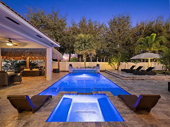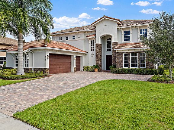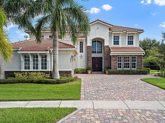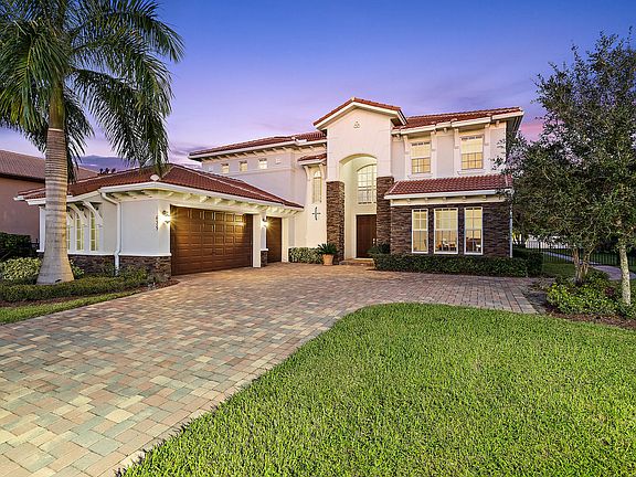 Stunning and immaculate, this luxury Stonegate model features 6 bedrooms (or 5 and office), 5 full baths and is located in Jupiter's highly sought after Rialto community! As you open the double front doors, you are greeted to the most magnificent and tranquil views of the resort style pool, spa and tiki-hut oasis on the expansive .40 acre lot. This home is built solid with hurricane glass windows throughout. Soaring ceilings, crown moldings and large picture windows make home open, flowing and excellent for entertaining. Master bedroom is on the main level with gorgeous wood grain tile, and two newly customized walk-in closets featuring the ultimate storage for your dream shoe collection!