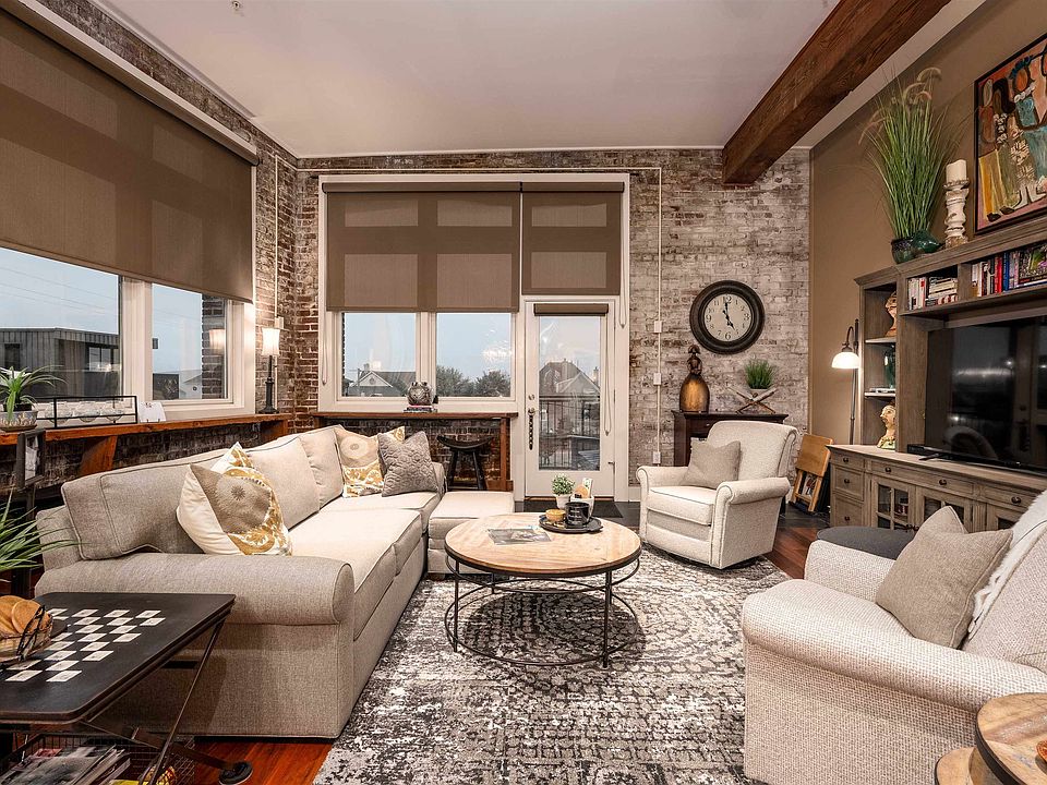 Beautiful Nettleton condo with wonderful accents consistent with the original building - shelves and desk area in the Living Room, bar counters by windows, shelving in the Primary Bathroom, and a huge barn door in the Primary Bedroom. Large built-in at entry includes a wine rack, bench,& shelving. Walk-in closets with custom shelving in each Bedroom. There is also an additional sleeping loft located above the guest bedroom closet - could be used as attic storage. Primary Bathroom has double vanity, whirlpool tub and shower. Wraparound balcony with fantastic Mississippi River views for watching the sunset each night! Rooftop deck with river views, bridge views, as well as the city skyline. Blue shutters and the three tall white mirrored shutters are excluded from sale. AC replaced 2022. All new windows coming!! Incl. 1 reserved garage space #17 and 1 first-come, first-served unassigned space in the gated parking. No rentals allowed. Basic cable Direct TV/Internet included.