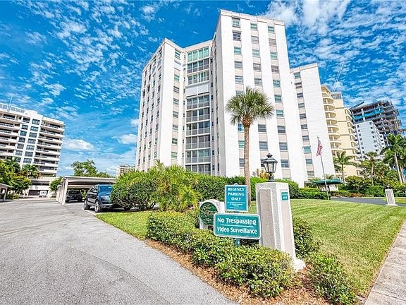 Open the door to the million dollar views from the 8th floor of The Regency. The great room in this unit is spectacular (35x29) with endless room layout configurations. The Regency is a wonderful building with friendly neighbors and staff; a gem in the prime Palm Ave location. Walk out the rear door and you are in hub of fine dining, galleries and shopping. Walk out the front door and you can cross the street to the Marina, City Island Park, and the majestic Ringling Bridge connecting you to St. Armands. This lovingly well-maintained unit has a water view from every room and is the rare true three bedroom floorplan. Sellers installed soundproof sliders in the great room and also tiled the walk-in shower in the master bath. So much storage, including a large maintenance/storage room. Laundry in your unit has been approved and the estimate to put it in one of the three closets adjacent to the master bedroom is approximately $3500. Regency has 24 hour concierge and is well-managed. This unit is a blank canvas awaiting its new owners' vision. Schedule an appointment to have your breath taken away!