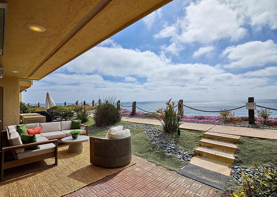 Experience the epitome of coastal luxury in this remodeled oceanfront condo done to perfection! This single level unit on the main floor boasts amazing unobstructed ocean views from almost every room and direct beach access just steps from your door. The home was exquisitely designed with a sleek, modern aesthetic and meticulous attention to detail. Imported Italian marble countertops and backsplash in the kitchen and bathrooms, high-end European-style soft-close cabinets and drawers, premium appliances with custom cabinet fronts. Both bathrooms have been fully renovated with imported Italian marble, textured wall tiles, high-end faucets, and Toto toilets; the primary bath boasts heated floors and a luxurious shower. Additional upgrades include in unit washer/dryer, Rejuvenation Hardware cabinet pulls and door hardware, high-end vinyl plank flooring, recessed ceiling lights throughout, a newer zoned Heat/AC system, voice activated automatic blinds, custom entertainment center, and surround sound system. Expansive outdoor patio with built in heaters offers the perfect spot to enjoy gorgeous sunsets and panoramic ocean views. The HOA permits short-term rentals with a 7-night minimum, making this property an excellent opportunity for vacation rental income. Enjoy community amenities including a pool, two hot tubs, four tennis courts, clubhouse, and gated entry. Unit includes two assigned side by side parking spaces in secured garage and additional storage unit. Solana Beach is one of the most coveted locations in coastal San Diego, and is located minutes from the vibrant Cedros Design District and Del Mar Fairgrounds. Walk to restaurants, cafés, bakeries, train station, farmer’s market, art galleries, music venues, and much more. Come live the Southern California lifestyle you’ve always dreamed of!