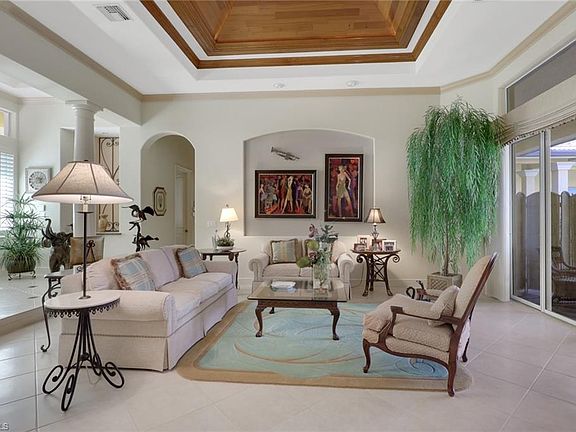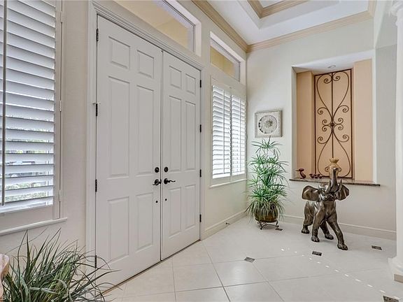 Experience exceptional luxury living in one of Naples premier country club communities. This estate home offers 5,402 total square feet of interior and exterior living. The Wellington Courtyard Model has soaring tray ceiling that are lined with beautiful wood, 4 bedrooms, 4 1/2 bathrooms, bar with wine cooler and 5 car garage. The primary bedroom has 2 walk in closets, 2 primary bathrooms, 2 hot water heaters and 2 AC units. All have been meticulously maintained. Entertain your guests in the expansive lanai with long lake and fountain views. Multiple seating areas, swimming pool and hot tub with fountain views offer a serene lifestyle. A separate "in law" quarters provides privacy for guests and family. The Vineyards has 2 award winning 18 hole championship golf courses, wellness center with fitness and spa, fine dining in the newly renovated clubhouse, 2 swimming pools, tennis and pickleball courts and a beautiful Acqua bar. Convenient access to the Crossroads Shopping Center which includes Publix, Walgrens, restaurants, mail facility, banks and vet services.. Physician's Regional Hospital and doctor offices are also nearby. Don't miss your opportunity to live in paradise.