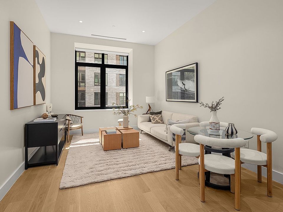 Residents are welcomed by a luminous open-plan living room, dining room, and kitchen with soaring ceilings, seamless white oak floors, and oversized casement windows with deep sills.