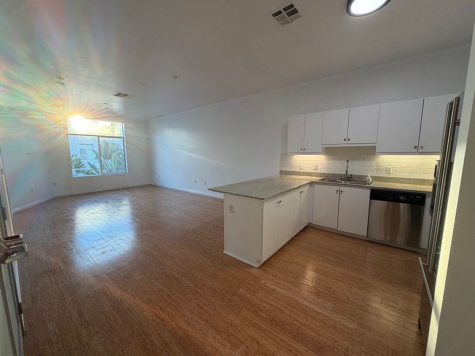 Light-filled and beautifully maintained two-bedroom, two-bath condo in the Harbor Lofts community, located in the heart of downtown Anaheim. Nearly 1,100 sq. ft. of open living space with high ceilings, huge windows, and bamboo flooring throughout. The unit features a modern kitchen, Bosch stacked washer-dryer, central air, and two tandem parking spaces. Freshly painted and upgraded with thoughtful finishes, this home has been meticulously cared for with only two tenants since construction (in 2007).