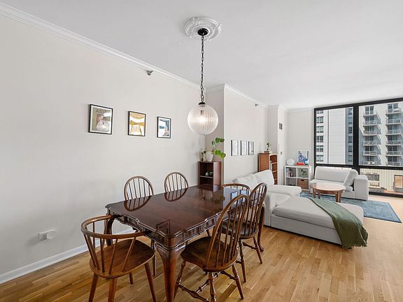 Stunning NE facing 2 bed, 2 bath condo in desirable River North! Open concept floor plan with dining room/ living room combo, cozy gas fireplace with custom mantle, and incredible city views that open out to your private balcony - perfect for entertaining! Chef's inspired Kitchen features white cabinetry with black hardware, striking white quartz countertops, subway tile backsplash, and stainless steel appliances. Spacious primary bedroom features breathtaking city views, floor to ceiling windows, and ample closet space. Spa like en-suite bath features, custom dual vanity, glass steam shower & soaking tub. Gleaming engineered hardwood floors throughout. In-unit laundry. Building amenities include a fitness center, party room, and roof deck. This home is steps from CTA stops, East Bank Club, dog parks, restaurants, coffee shops & the nightlife River North has to offer. 1 garage parking space for an additional $35K!