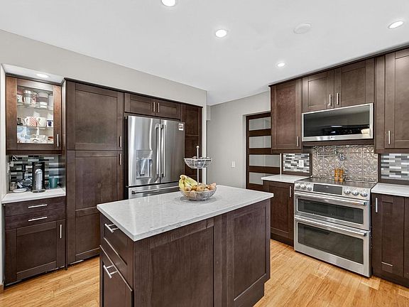 Sun-filled newer roomCozy family roomWalk-in closetQuartz countersTile backsplashFresh paintBrick gas fireplace