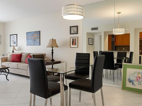 Bright and inviting living/dining area with neutral tile floors, modern lighting, and mirrored accent wall. Open kitchen layout provides a spacious feel, perfect for entertaining and everyday living. Updated kitchen with wood cabinetry, granite countertops, mosaic backsplash. Features stainless steel appliances, modern range hood, and ample storage. Warm finishes and open layout create a functional, inviting space. Guest bathroom with marble-style vanity, modern fixtures, and easy walk-in shower for safety. Primary bathroom clean and bright with tiled shower/tub combo, grab bars, and neutral finishes. Private enclosed balcony for added living space space featuring floor-to-ceiling sliding glass doors for fresh SE breezes. Assessments paid by seller. Maintenance contract in place.