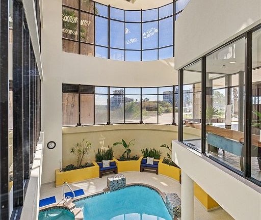 The open-concept kitchen features warm wood cabinetry, built-in microwave, double sinks, refrigerator, and washer and dryer—all to remain. The generous living and dining areas include a wet bar, electric exterior shutters—operated at the touch of a button.