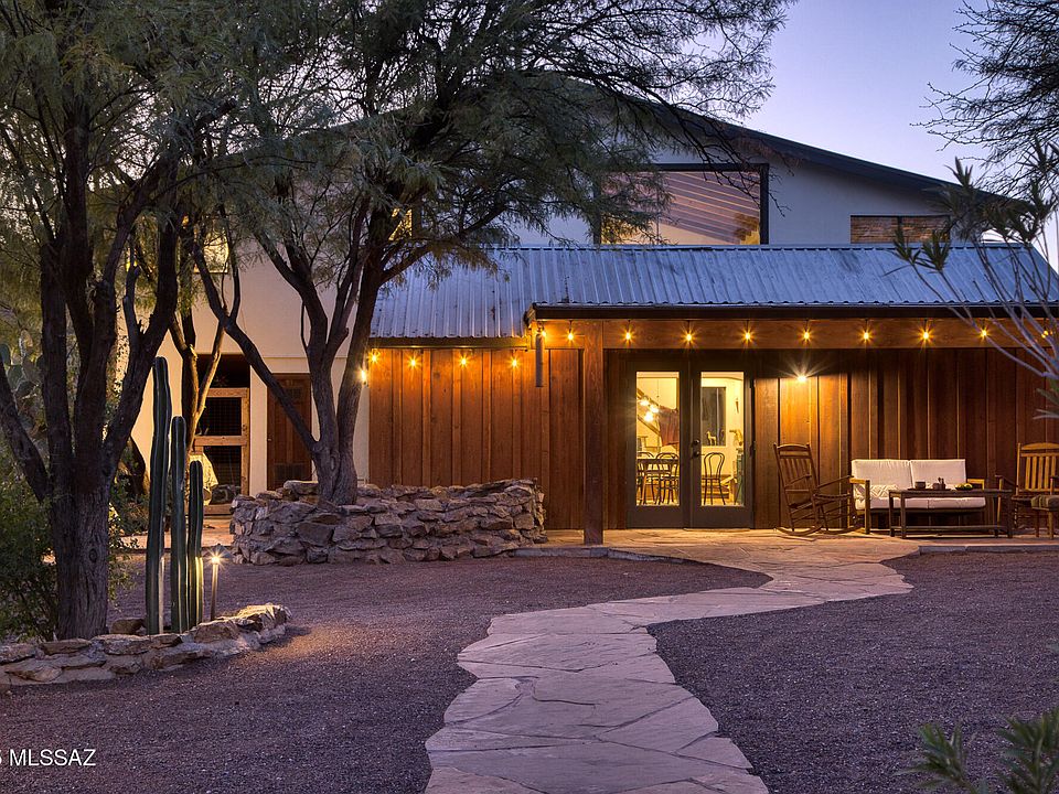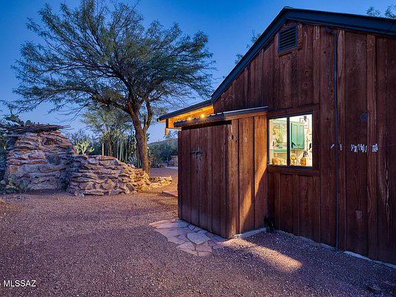 Experience uninterrupted, protected desert views and wide-open space. Nestled against the backdrop of the Tucson Mountains, this home offers direct access to bike and running trails, immersing you in the beauty of the surrounding desert landscape. For those dreaming of off-grid living, the property is equipped with solar owned panels and a water harvest filtration system, allowing you to utilize rainwater for most of your needs beside city water. In addition to the 2 story main house with it's 2,057 sq.ft. of open-concept living, beam ceilings and stunning sunset views, the property offers additional 1,947 sq.ft. of conditioned buildings, which includes guest quarters. With its extra conditioned space, the property features a newly built, spacious workshop, providing endless possibilities for creative projects, storage, or workspaces. The second building is a shop/studio space w/support beams from Catalina Theater & stained glass from a saloon in Phx. The building has a spiral staircase to access rooftop deck and a fish pond, bringing a peaceful water element to this desert oasis.