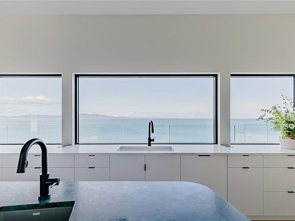 Oceanfront masterpieceOpen-concept designSleek kitchenPristine white cabinetryLarge islandFloor-to-ceiling glass doorsBreathtaking vistas