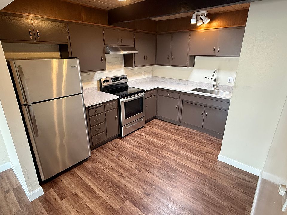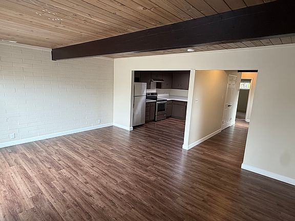 This two-bedroom home features a large living room and spacious kitchen. The unit is freshly updated with modern appliances and features wood beam ceilings. A private wooden deck is an added bonus, great for sitting and extra storage.