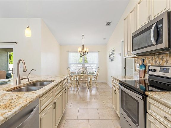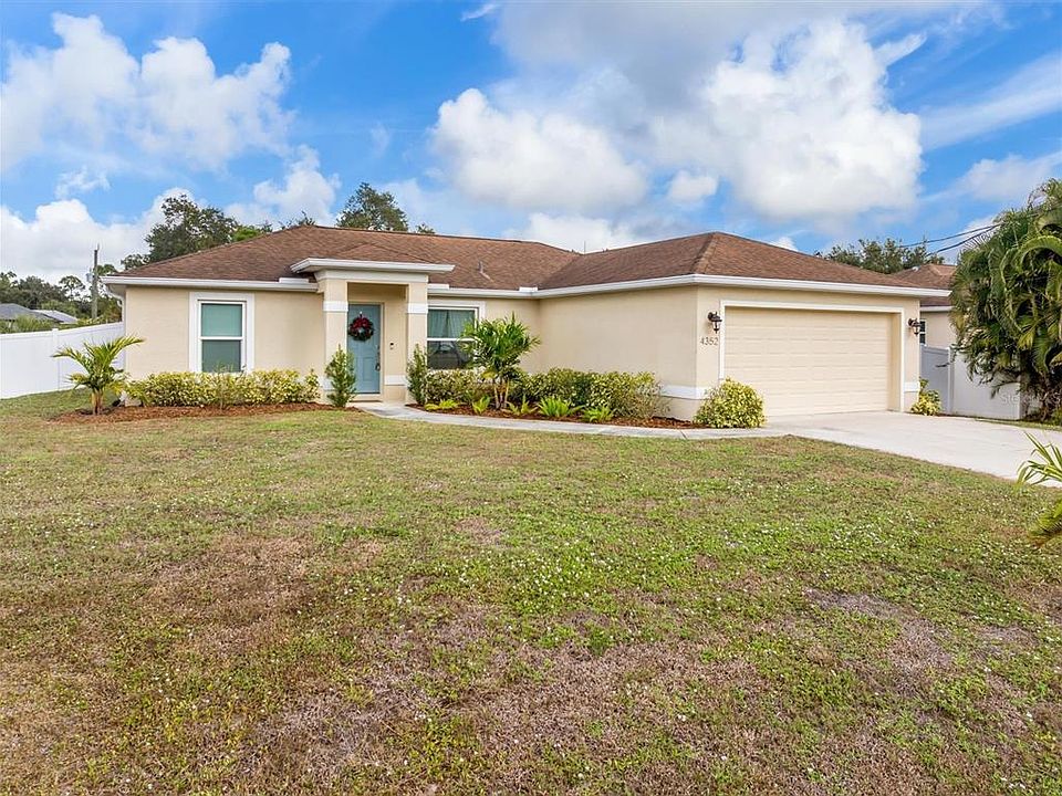 Step into this IMMACULATE 3 BEDROOM, 2 BATH HOME built in 2017, loaded with modern upgrades and MOVE-IN READY COMFORT! Featuring TILE FLOORING THROUGHOUT and a desirable SPLIT FLOOR PLAN, this home is designed for both style and functionality. The heart of the home is the DREAM KITCHEN, boasting GRANITE COUNTERTOPS, STAINLESS STEEL APPLIANCES, a TILE BACKSPLASH, and SOLID WOOD SOFT CLOSE CABINETRY—perfect for cooking, entertaining, and everyday living. The spacious primary suite offers DUAL CLOSETS and a luxurious ensuite bath with a FLOOR-TO-CEILING TILED WALK-IN SHOWER and DUAL VANITY WITH GRANITE COUNTERTOPS. Your guests will appreciate their private wing, complete with 2 bedrooms and a beautifully upgraded bathroom featuring a TILED SHOWER/TUB COMBO and GRANITE VANITY. The garage includes BUILT-IN CABINETRY, ideal for storage or the HANDYPERSON’S WORKSPACE. Enjoy the Florida lifestyle outdoors with a SCREENED-IN PORCH, a SPACIOUS PAVER PATIO perfect for gatherings, and a FULLY FENCED BACKYARD for added privacy and peace of mind. The home is equipped with an irrigation system as well. Additional perks include PGT IMPACT-RESISTANT WINDOWS & SLIDERS, NO HOA, and an X FLOOD ZONE LOCATION (NO FLOOD INSURANCE REQUIRED!). Conveniently located near I-75, shopping, schools, parks, the RAYS SPRING TRAINING VENUE, SUNSEEKER RESORT, and several GULF COAST BEACHES. This home checks every box—STYLE, SAFETY, LOCATION, AND VALUE. Don’t miss it!