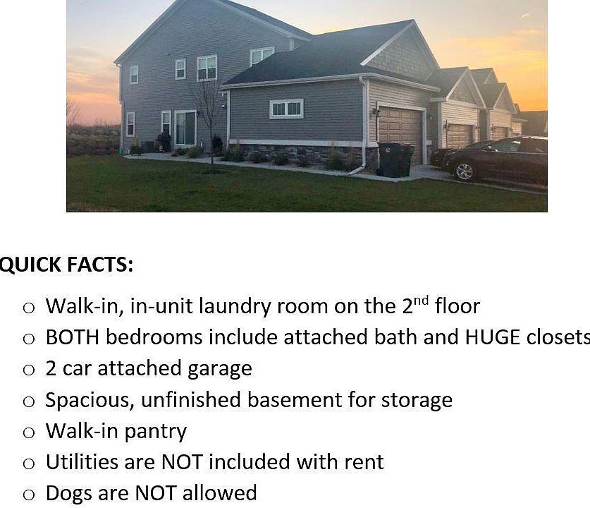 Beautiful two bedroom townhouse located in a great neighborhood in Windsor, WI. Available for move-in on June 1st. BOTH bedrooms have its own attached bathroom. Two-car attached garage with own private drive. Second floor, walk-in laundry room. Unfinished basement great for additional storage. Townhouse-style apartment is located 5 minutes away from the interstate and 15 minutes away from MSN airport. Cats allowed based on owner's discretion. Utilities are not included. Tenant is responsible for snow removal. *Will send virtual tour upon request*. Tenant is responsible for utilities and snow removal. Landlord will manage lawn care.