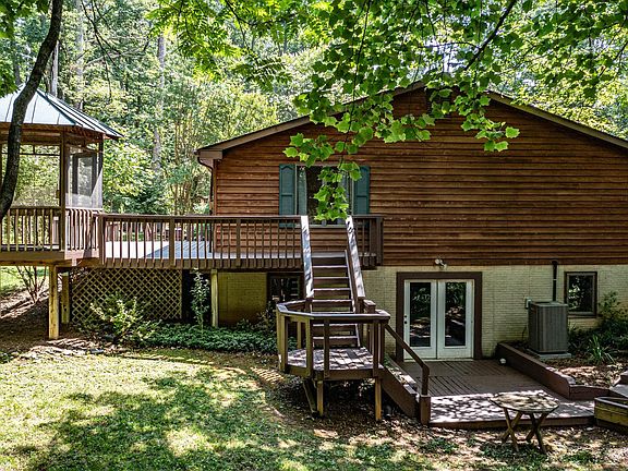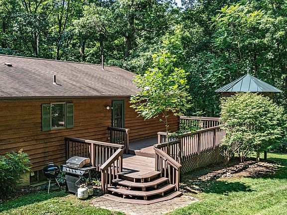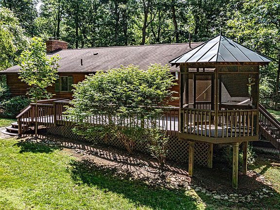 Step into this inviting wooded retreat and feel right at home. Three bedrooms and 3 full baths situated on over four acres of peaceful serenity, this property offers a private sanctuary for you to enjoy. As you enter, you'll be greeted with warmth and elegance. The great room beckons with its masonry fireplace, providing a cozy focal point for gatherings and relaxation. Adjacent to the eat-in kitchen, you'll find a separate dining room, creating the perfect space for entertaining family and friends. The kitchen itself boasts Silestone counters, a convenient breakfast bar, a built-in desk, and updated appliances, ensuring both style and functionality. Allow the sunroom to mesmerize you with its floor-to-ceiling windows and skylights, flooding the space with natural light. Adorned with ceramic tile flooring, it's a serene spot to enjoy the surrounding views. The main level primary bedroom suite offers a tranquil retreat, where you can bask in incredible vistas or step out onto the multi-level deck with a screened-in gazebo. This home has passive solar an energy efficient design. The lower level offers a work room, bar, full bath, den, wood stove and is walkout level. Has starlink satellite. Central AC replaced in 2020.