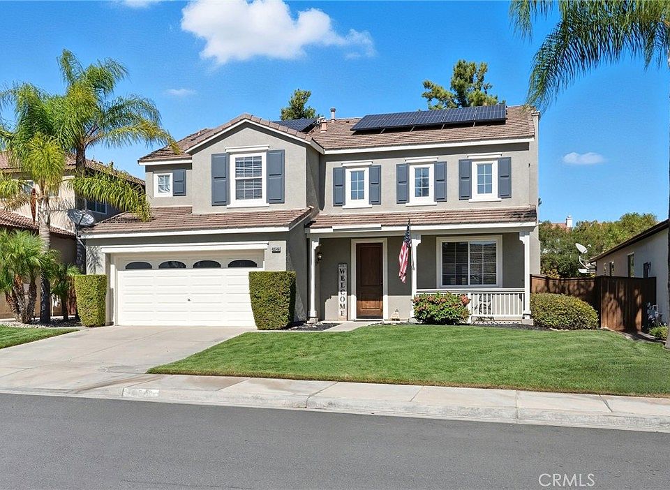 Welcome to your remodeled two-story home in Paseo del Sol, featuring paid solar panels for added energy efficiency. The curb appeal is impressive, and as you enter, you'll notice the high ceilings and newer vinyl flooring. The spacious formal living room transitions smoothly into the dining area, which includes built-in shelving and a cozy gas fireplace with a rock hearth. The updated kitchen showcases white upper cabinets, dark gray lower cabinets, beautiful quartz countertops, a subway tile backsplash, and newer stainless-steel appliances. There is a farmhouse sink and a breakfast bar, along with an eating area that has a built-in buffet for casual meals. A bonus room off the kitchen offers flexibility and can serve as an additional TV room, playroom or has potential to be a downstairs bedroom or office. There's also a convenient powder bathroom on the main floor with an updated vanity and granite countertops. Upstairs, the primary suite features a separate tub and shower, newer granite counters, dual sinks, and a spacious walk-in closet. You'll find three additional bedrooms, two of which have walk-in closets. One guest bedroom features an en-suite bath with dual sinks and separate hallway access. The property includes a two-car garage and a low-maintenance, pool-sized backyard, ideal for entertaining. The yard features artificial turf for easy upkeep and comes with a newer above-ground spa. The highly desirable community of Paseo Del Sol is located in the Temecula Valley High School district and is close to Abby Reinke Elementary. Residents can enjoy two community pools, a clubhouse, a fitness center, walking trails, a playground, sports courts, and more. Plus, you’re just minutes away from Temecula wine country, historic Old Town, and various restaurants and shops along Temecula Parkway and Rancho California.