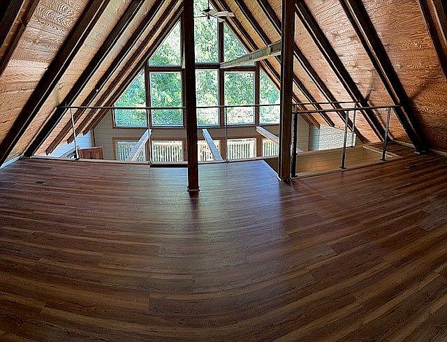 This A-Frame home has 2 bedrooms with a loft that can be used as an additional bedroom. The walk-out basement has poured walls and framed for additional living space. The sell includes two lots. The home sits on 2.94 acres and has 11.49 acre wooded parcel adjacent to the east. The home and 2.94 acres can be purchased for $285,000. The 11.49 wooded parcel can be purchased for $200,000. Or the two parcels can be purchased for $485,000. Complete remodel in 2025 with walls and ceilings to studs, all new drywall, flooring, loft cable railing, and bathroom. More photos will be uploaded soon!