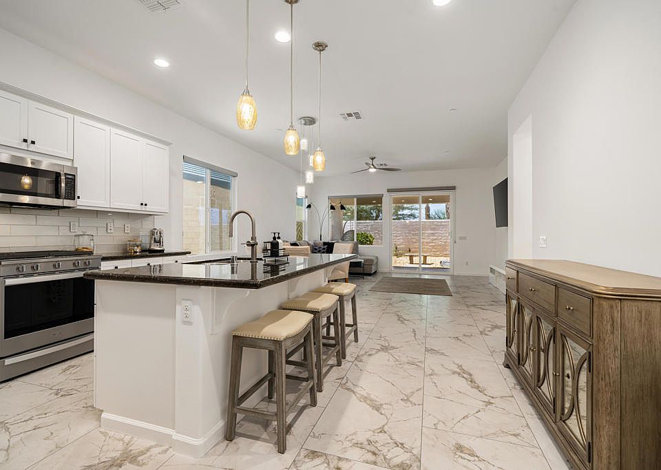 Welcome to 43553 Treviso Drive at Four Seasons Terra Lago -- Award-Winning Resort-Style Living!This beautifully upgraded home blends comfort, efficiency, and style with all the perks in Indio's premier 55+ guard-gated community.Inside, the open-concept floor plan offers 2 spacious bedrooms, 2 bathrooms, and a versatile den ideal for a home office or guest retreat. A 2-car garage plus dedicated golf cart bay provides ample storage. The home has been enhanced with brand-new designer tile flooring, soaring ceilings, recessed lighting, and custom window treatments. The chef's kitchen is a true highlight, featuring granite countertops, white cabinetry with updated pulls, stainless steel appliances, a stool-height island with pendant lighting, and seamless flow into the dining and great room with direct patio access.The primary suite boasts abundant natural light, a walk-in closet, and a spa-like bath with dual vanities, a glass-enclosed shower, and refreshed fixtures. Additional upgrades include a finished laundry room with cabinets and utility sink, washer/dryer, and a tankless water heater. Outdoors, enjoy a covered patio extended with elegant pavers--perfect for entertaining or relaxing--with room to add a spa or water feature.At Four Seasons Terra Lago, resort-style amenities await. The 22,000 sq ft lodge features a state-of-the-art fitness center, full-service salon, yoga and aerobics studios, library, billiard room, ballroom, bistro, and both indoor and outdoor pools. Residents also enjoy tennis, pickleball, golf, and countless organized activities. Beyond the gates, you're just minutes from Acrisure Arena, world-class casinos, hiking, dining, and shopping, with easy freeway access to La Quinta, Palm Desert, and Palm Springs.Experience the ultimate in desert living with this rare opportunity--schedule your private tour today!