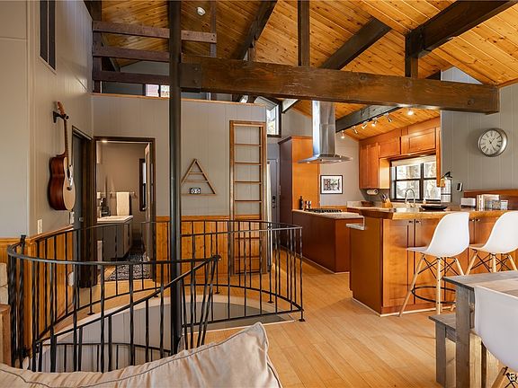 Perfectly positioned amongst the oaks and pines in upper Moonridge, this modern rustic tree house is truly something special. Intriguing architectural design and multi-level decking allow for intimate outdoor living, distant mountain views, and a feeling of serenity and seclusion. This cabin has been superbly remodeled with updates including a new roof, black aluminum Milgard windows and patio doors, siding, paint, completely rebuilt decking and entryways, and level concrete parking for 3-4 vehicles. All new furnishings and window coverings including an Aurhus sofa and Sleep Number bed, new A/C unit, and water heater. Main level living area features beamed ceilings, river rock fireplace, wainscoting, ceiling fan, a small loft, and deck access. The gorgeous kitchen offers abundant custom cabinetry, granite, high-end stainless appliances, an island with gas range and vented hood, new gas stove, wine fridge, a breakfast bar, and adjacent dining area. Middle level has second living area/family/game room with efficient wood stove, second bedroom, and bath, and access to deck and spa. Lower level offers a spacious third bedroom with custom tile flooring, sitting area, and access to the backyard. The sprawling 1/4 acre lot is awesome for winter snow play; would make a fantastic vacation rental. Enjoy the tree-lined street with the joy of the changing seasons on display, and views of the ski slopes revealed when the leaves fall away. Go experience this enchanting property today.