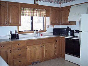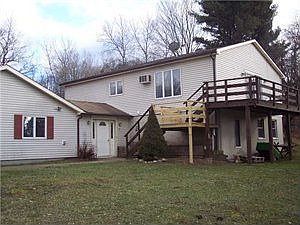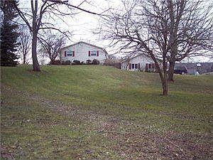 striking hillside ranch features stone fireplace in livingroom, beamed ceiling, open floor plan with 2 bedrooms up and 1 at ground level.2 full baths, all good size rooms. Great views of the surrounding countryside and the Catt.creek which runs thru the rear of the property. Large landscapped yard with deck and invisable dog fence included. Lovely kitchen cupboards with pantry. Many updates.,