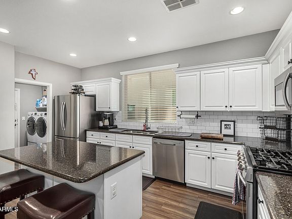 Don't miss your chance to own this charming 2-story beauty with a 2-car garage located inside MORRISON RANCH! Inside, you'll be greeted by wood-like tile floors and an inviting living room that sets the tone for comfort and style. The kitchen is a showstopper with its granite counters, subway tile backsplash, center island with a breakfast bar, crisp white cabinetry with crown molding, recessed lighting, and sleek stainless-steel appliances. Retreat to the primary suite featuring a luxurious bathroom with dual sinks and a soaking tub, your own personal haven! Need more space? The loft is perfect for a media center or cozy hangout zone. Check out the back to enjoy the covered patio and play area. Come see this gem and fall in love!