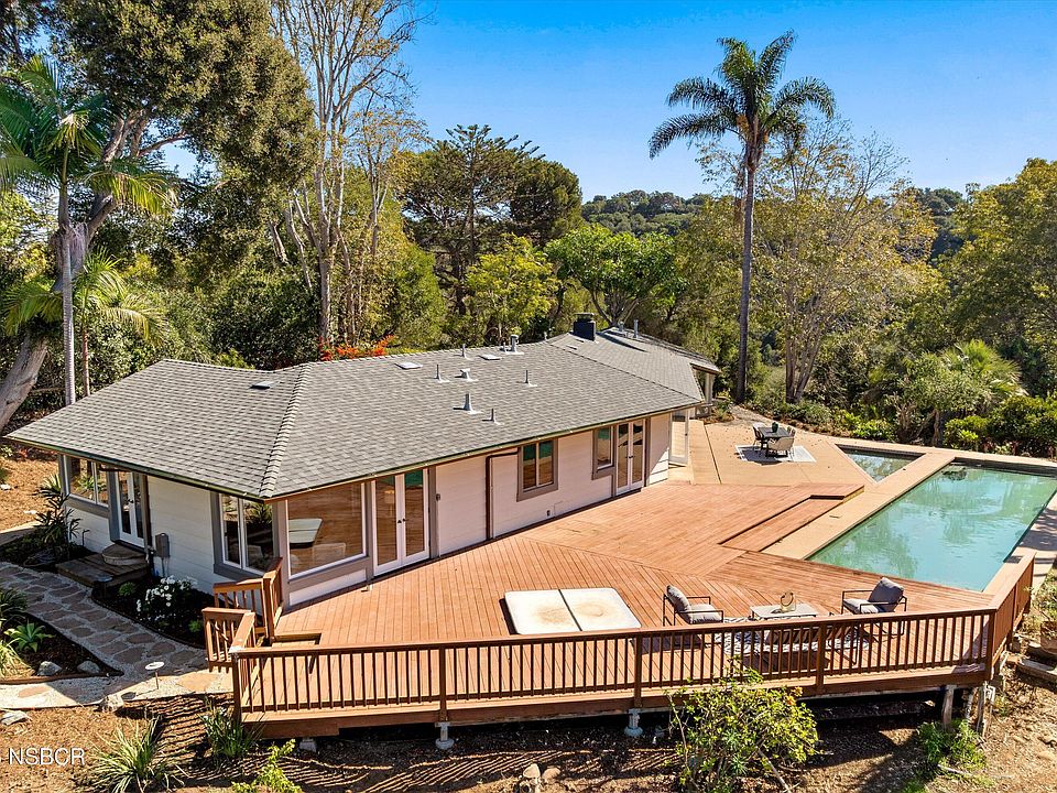 Nestled in the coveted enclave of Hope Ranch, this 3-bedroom, 3-bathroom residence sits on approximately 1.5 acres of private grounds. Offering +/-2,782 square feet of living space, the home features bright, spacious interiors that flow effortlessly to expansive decks and patios for seamless access to the outdoor entertaining areas. The property enjoys filtered ocean mountain views and abundant natural light, creating a serene and inviting atmosphere throughout. Designed for indoor-outdoor living, the backyard offers a true retreat, complete with a sparkling pool, kiddie pool, and in-ground spa. Recent updates include a new roof and gutters, new flooring and paint, and new appliances. A hidden wine cellar blends timeless charm with modern convenience. Enjoy private access to The Hope Ranch beach and enchanting hiking and equestrian trails. Proximate to shopping and dining, this home presents an exceptional opportunity to customize and create your dream estate.