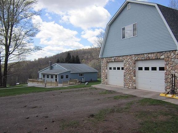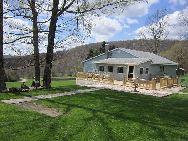 FOREVER VIEWS from this very special CATSKILL Mountain property on 11.3 AC. with POND. Quiet, private location at the top of a high mountain valley. Leave the hustle behind and enjoy a simpler existance. The outstanding Kitchen is made for those who enjoy cooking; a gas stove, pantry, wine cabinet and cooler and an island that could seat the entire family. The Dining Room which overlooks the view and the Family room are finished in tongue and groove pine. A Living room, 2 Bedrooms and a large Bath with a Jacuzzi Tub and a step-in Shower complete the 1st floor. There are 2 small rooms in the walk-out basement that function as a 3rd bedroom and an office. The 11.3 Acres has all the wood needed for the Wood/Oil Combination Furnace. LOW TAXES, heat and electric cost are easy on expenses. The 2 Story Garage with stone facade to match the house has a 2ND FLOOR that could be a small apartment. A one story addition provides storage for ATVs and Mower This is a well maintained home with beautiful new deck and thoughtful landscaping. It's a must see!