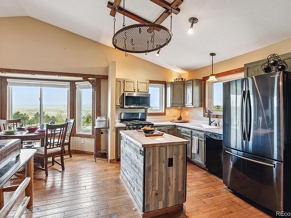Welcome to your slice of country paradise in Sun Country Meadows! Nestled on over 2 acres of picturesque land, this charming home offers a perfect blend of rustic elegance and modern comfort. As you step inside, you're greeted by the inviting vaulted main level adorned with gorgeous wood floors that exude warmth and character. The cozy living room, complete with a wood-burning fireplace, sets the stage for both formal gatherings and laid-back evenings. Adjacent is the spacious kitchen, featuring a convenient island with a butcher block countertop, ideal for culinary adventures. The sunny breakfast nook provides a serene spot to savor your morning coffee while soaking in the expansive views of the surrounding landscape. The master suite, boasting a private bath, offers a tranquil retreat after a long day, while the second bedroom on the main level provides versatility and convenience with access to a full hall bath. But the true heart of this home lies in the finished walkout basement, where the fun and festivities continue. With a family room perfect for entertaining, 3 additional bedrooms, and a shared 3/4 bath, it's an ideal space for teens, guests, or even an art or craft studio. Outside, the enchanting yard beckons with fruit trees, a charming chicken coop, and detached garage/storage shed where the handyman in the family will appreciate the super workshop, offering ample space for projects and hobbies. Take in the breathtaking views from the deck while enjoying outdoor activities with family and friends. Special features such as James Hardy siding, an insulated garage door, and two propane tanks (one owned, one leased), new gas stove, new fridge & microwave, 7 new windows, new 50 gal water heater, new locks, & zoned for horses add to the allure of this remarkable property. Don't miss out on this incredible opportunity to embrace the tranquility and beauty of Elizabeth living. Schedule your showing today and make this Sun Country Meadows gem your own!