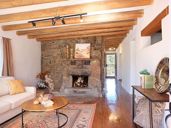 The existing home is filled with Southwestern character, featuring viga ceilings and a cozy fireplace. Natural light flows through the inviting floor plan, offering a comfortable balance of charm and functionality.