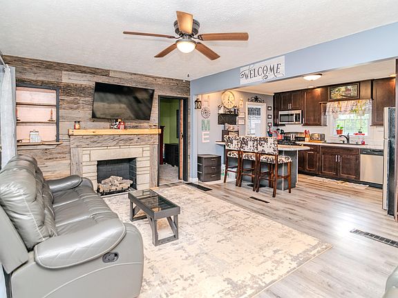 Inside, the home features a warm custom-built fireplace with a built-in breakfast bar, creating a cozy centerpiece for gatherings. Durable vinyl flooring flows throughout the main living areas and kitchen, while a dedicated laundry room adds convenience. A detached garage provides parking and storage flexibility. Outdoors, a large back deck overlooks the fenced yard—perfect for entertaining, gardening, or quiet relaxation.