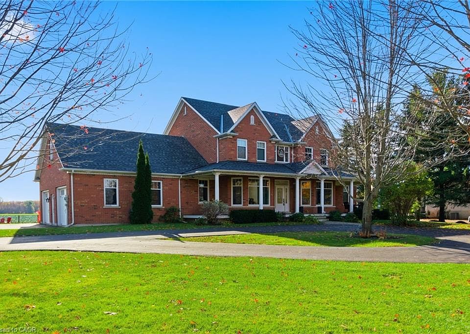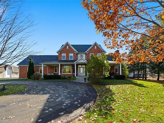 Nearly 5,000 sq ft of custom finished living space across three levels, offering 6 bedrooms and 5 bathrooms, set on a pristine 1-acre lot in Carlisle, plus a separate heated 50’ x 30’ garage/workshop with a winterized loft bedroom. This exceptional multi-generational custom home features a main-floor primary suite with vaulted ceilings and a spa-like 6-piece ensuite, soaring ceilings, floor-to-ceiling windows, and a custom stone gas fireplace anchoring the bright open family room. Designed for everyday living and entertaining, the home offers separate living and dining rooms, an eat-in kitchen with ample storage and stainless steel appliances, and a walkout to the rear deck with long-range country views. Main-floor laundry provides convenient access to both the garage and basement. The fully finished lower level includes above-grade windows, 9-foot ceilings, additional baseboard heating, an upgraded kitchen, two bedrooms, and a bathroom, along with a separate entrance, making it ideal for guests or an in-law suite, plus a walkout to the patio and backyard. Exceptional curb appeal features landscaped grounds, circular drive, and a classic full-width front porch. Additional highlights include roof (2023), owned hot water tank, water softener, reverse osmosis and water treatment system, Generac generator, dual 200-amp electrical panels, and security system with cameras—offering the perfect blend of peaceful country living and everyday convenience, minutes to parks, schools, highways, and major amenities.