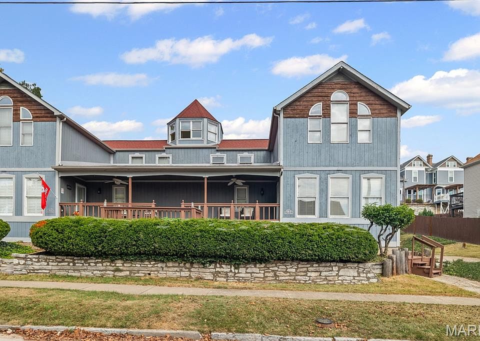 Nice single attached residential home. Has a unique floor plan with the main level having a sitting area, kitchen, dining room, bath and a ladder leading to the Cupola where you can see the river. There is a one car oversized attached garage in back. Covered Back porch, a great place to rest your feet. Nicely landscaped. The upstairs loft has an area for your bedroom and a living area, bathroom, and a screened back porch. Within walking distance of restaurants, shopping, entertainment and antique stores. Close to downtown Alton and the River Road.