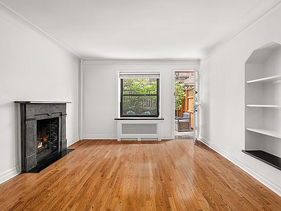 The apartment features beautiful wood floors, open kitchen, a decorative fireplace, built-in wall shelves and a large closet with built ins. The bathroom includes a large linen closet and soaking tub and shower.