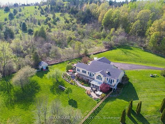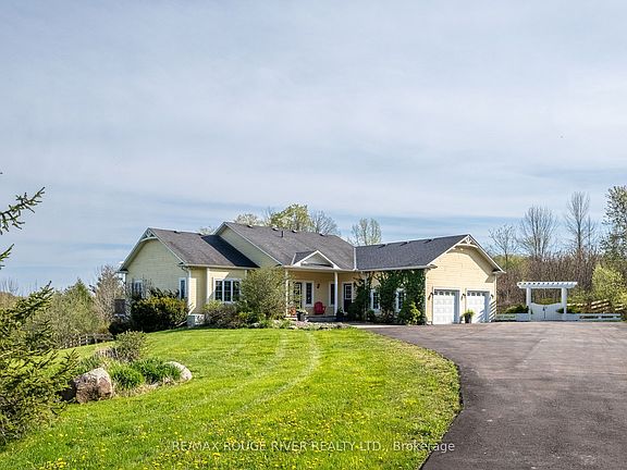 Perched atop 40 stunning acres in a prime location this custom-built equestrian residence commands panoramic vistas of the rolling Northumberland Hills from every window. Inside, discover grand principal rooms thoughtfully designed for effortless single-level living and sophisticated entertaining. The great room features vaulted ceilings, anchored by a magnificent stone fireplace. The gourmet kitchen flows seamlessly into a spacious family dining area. Retreat to the generous main-floor primary suite, complete with a walk-in closet, ensuite, and a private balcony perfect for capturing the sunrise. A welcoming den with a fireplace and a sun-drenched sunroom completes the main floor. The beautifully finished lower level provides ample space for family and guests including a home gym. A charming 4-bed bunkie offers additional versatile space. Multiple walkouts lead to landscaped perennial gardens and the estate's natural beauty. Explore private woodland trails to enjoy or simply immerse yourself in the peaceful ambiance of open pastures. For the equestrian enthusiast, the property features impressive facilities, including a modern 8-stall barn with tack, feed, and storage rooms that open into a bright, 6000 sq ft indoor riding arena. The picturesque lower acreage encompasses 7 paddocks and a bass-filled pond. This is not just a home; it's an invitation to embrace a legacy lifestyle.