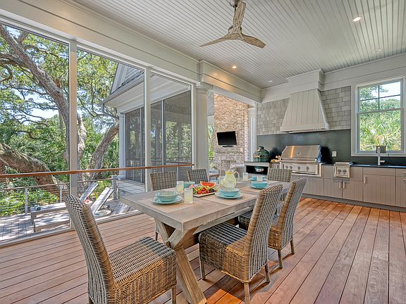 The screened dining and kitchen area brings the indoors out with a fully equipped chef's grill station, sink, prep space, and dining table with seating for six; you can serve freshly grilled seafood to friends without ever missing the golden light slipping through the trees.