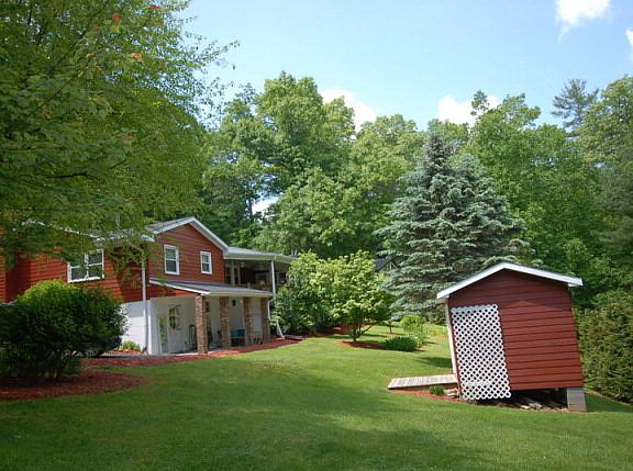 PARK-LIKE SETTING only minutes away from South Fork New River! This country rancher with redwood siding is meticulously landscaped with beautiful flowers, shrubs & trees. See the artist owner's influence in this warm & welcoming home featuring gleaming oak floors throughout the main level, living room with bay window & fireplace, nice & bright kitchen/dining combination, 3 bedrooms, 2 baths, office and sunroom. Lower level is fully finished and offers in-law suite with second kitchen, spacious living area, full bath, laundry area & additional room suitable for hobby room, workshop or storage. With this beautiful park-like setting, you'll want to spend plenty of time outdoors. Choose either the covered rocking chair front porch, the completely private covered back porch overlooking the picturebook lawn or the spacious pergola covered deck. Property also features a 2-car oversized detached garage and a garden shed. A LOT FOR THE MONEY!