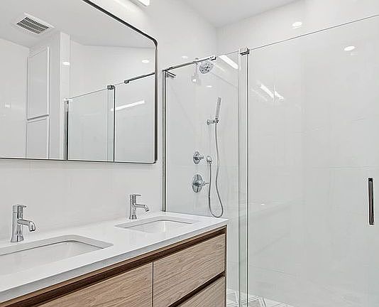 The primary bedroom is complete with spacious closet space and an en-suite bath featuring double vanity, walk in shower and marble floor tiles.