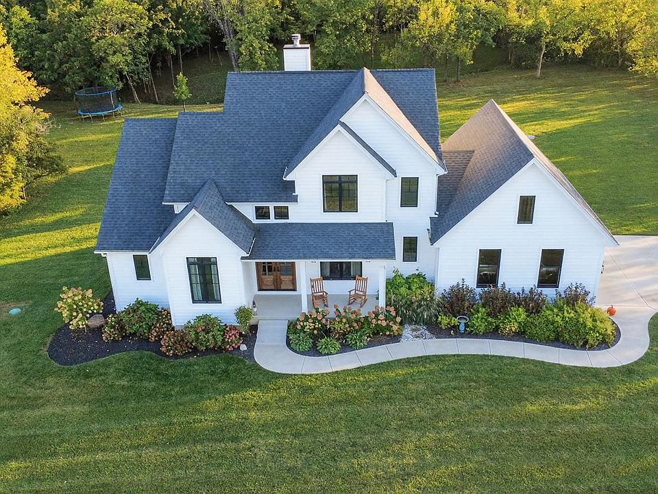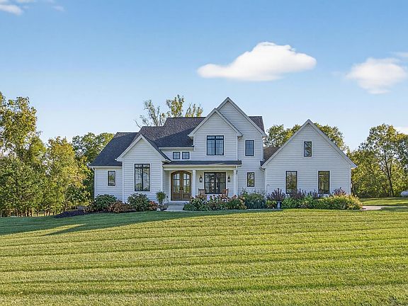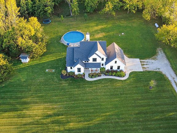 Stunning Modern Farmhouse on Nearly 9 Private Acres! Tucked away down a long, private driveway, this 3-bedroom, 2.5-bath home built in 2019 offers the perfect blend of upscale living and peaceful seclusion. Step inside through grand double front doors into a sun-filled great room with soaring cathedral ceilings, dramatic floor-to-ceiling stone fireplace, and striking black-framed windows that bring the outdoors in. The open-concept layout features a gourmet kitchen with a large island, granite countertops, and plenty of space for cooking, gathering, and entertaining. A first-floor laundry room adds everyday convenience. Retreat to the first-floor primary suite, which overlooks the private backyard and sparkling above-ground pool. The luxurious en-suite bath includes subway tile, a spacious tile shower, clawfoot soaking tub, double vanity, and a huge walk-in closet. With 9-foot ceilings throughout, room for storage, high-end finishes, and nearly 9 acres of privacy. This won't last