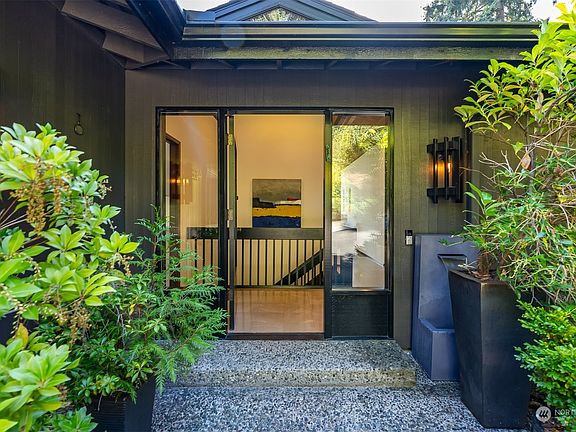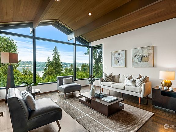 Nestled in Mercer Island's coveted Cedar Cove community, discover NW contemporary architecture from Ralph Anderson in this modern haven! Timeless design brings elegance w/sweeping Lake WA& Mt Rainier views. Meticulous details celebrate the PNW w/ gleaming hardwoods& vaulted ceilings offering a welcoming appeal. Whether taking in a magnificent sunrise from the deck or relaxing beside the cozy fireplace, time here is meant to be savored. Down the lane enjoy a sandy beach with 40'of shared waterfront &grassy lawn, perfect for kayaks or swimming. Main floor primary suite, lower- level bonus room, great storage, central AC& generous yard. Detailed updates throughout, lush grounds& ultimate privacy-distinctive living w/ high quality finishes!