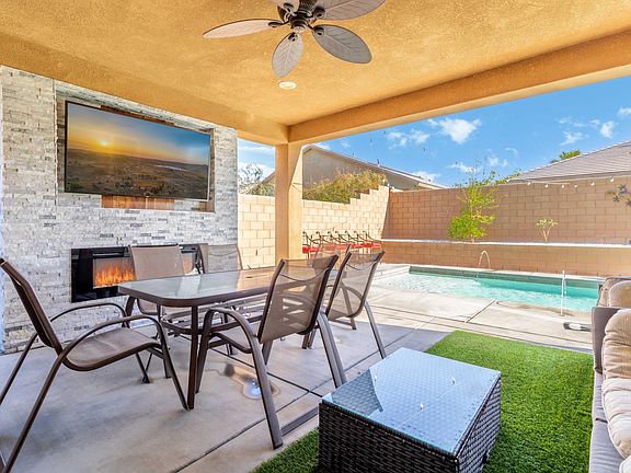 This modern, open floor plan home features 5 bedrooms, 4 bathrooms, and 9 foot plus high ceilings. Outdoor living at its finest with a long lap styled salt water pool. Patio covered area contains a gas fireplace, large screen TV, and plenty of seating. The great room has an adjoining pantry and large kitchen. It boasts granite countertops with a huge island for those who like to cook and entertain. The oversized master bedroom comes with a separate large walk-in closet and dual sink bathroom. You'll never want to get out of the rainfall tiled shower! House includes a segregated interior laundry room with a walk-in linen storage area. A large attached 3 car garage is perfect to store anything you need for your stay. Nestled in the beautiful Aliante Community, with 24 hour security, and walking distance to kids playground, soccer field, and basketball court. The community is a short drive to all that Coachella Valley has to offer including Fantasy Springs Resort Casino. Easily access the I-10 Freeway for any commute. Available for lease starting July 1st 2024. A 30-day minimum rental is required and a one year lease is preferred