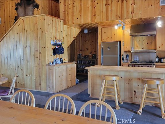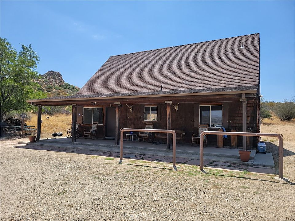 This majestic ranch has a picturesque cozy cabin style home with pine interior. The great room has a stone fireplace and 2 story vaulted ceilings open to the kitchen and an upstairs loft which could be converted into a 3rd bedroom. Other house features include steel security shutters, central AC/heat and concrete floors throughout. The front of the home has a full length covered porch with views of surrounding mountains and the pond. There is a Flag stone patio area with a fire pit circle with bench seating and an outdoor cooking setup with wood fired roasting pit with a gaucho crank style grill. The seller says the irrigation pond is nearly 1/4 acre in size with a dock and next to the pond is a covered gazebo. Garage is constructed of concrete block oversized 2 car capacity. There are 3 horse corals on the property with plenty of room to expand facilities. The lay of the land is gently sloping up to the house and garage then sloping up to a rocky peak on the east side. With 19+ acres there is lots of room for horses, orchards, farming and more. The neighboring 18 acres to the north is also available for sale, apn#579-150-053; see MLS# SW22183689 and buy both parcels together for an almost 40 acre ranch.