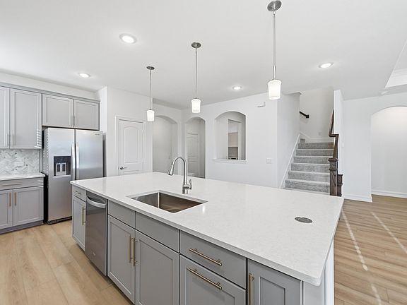 Step inside to discover an open and airy layout with elegant vinyl flooring that flows seamlessly through the main living areas. The bedrooms are cozy and carpeted, offering the perfect retreat for relaxation. The heart of the home is the modern kitchen, complete with sleek stainless steel appliances, a large kitchen island, and plenty of cabinet space for all your culinary needs.
