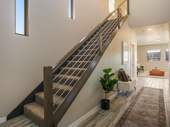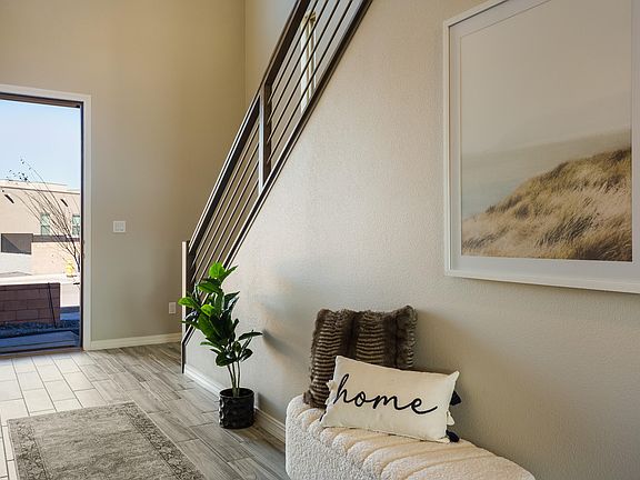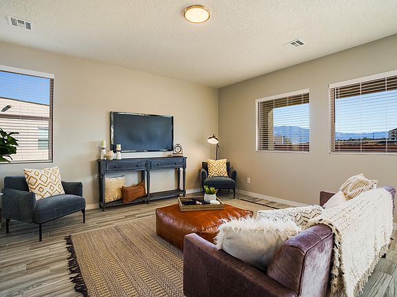 The Mazatlan by Abrazo Homes. where elegance and functionality blend seamlessly in every detail. Step inside to discover beautiful tile floors that span the open-concept living areas, creating a sense of spaciousness and flow. The heart of this home is its impeccably designed kitchen featuring solid surface counters, ideal for both everyday cooking and entertaining guests. Upstairs, the expansive loft and bonus flex room offer versatile spaces tailored to your lifestyle, whether you envision a quiet retreat, a home gym, or a play area for children.Escape to the second story primary suite, which boasts a private deck overlooking the picturesque Sandias