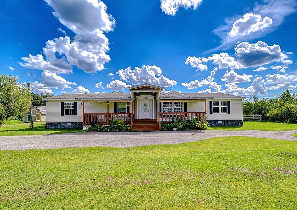 Welcome to country living with convenience! This spacious 2006 Fleetwood home offers 1,836 sq. ft. of living space on 5 acres, perfectly blending comfort, function, and room to roam. Inside, you’ll find 3 bedrooms, 2 bathrooms, and even a built-in office nook. The layout includes a large open living room that flows seamlessly into the kitchen and dining area ideal for everyday living or entertaining. The family room with a fireplace is set near the guest bedrooms, making it a great spot for a second living area, playroom, or media room. The master suite is located just off the main living area and easily accommodates a king-size bedroom set. It features a generous walk-in closet and a full bath with a walk-in shower. Neutral paint throughout the home allows you to move right in and make it your own. A laundry room is conveniently located just off the kitchen. Step outside and you’ll be greeted by a welcoming front porch the perfect place for morning coffee or unwinding at the end of the day. Beyond the home, the property offers endless possibilities. A horse barn sits at the backyard for equestrian enthusiasts, and there’s a shed for lawn equipment, feed, or storage. With 5 acres at your disposal, there’s plenty of space to bring the boat, ATVs, or any outdoor toys you’d like. Located between Zephyrhills and Lakeland, you’ll enjoy the peace of rural living with easy access to nearby amenities. Don’t miss the chance to make this property your own. Schedule your showing today!
