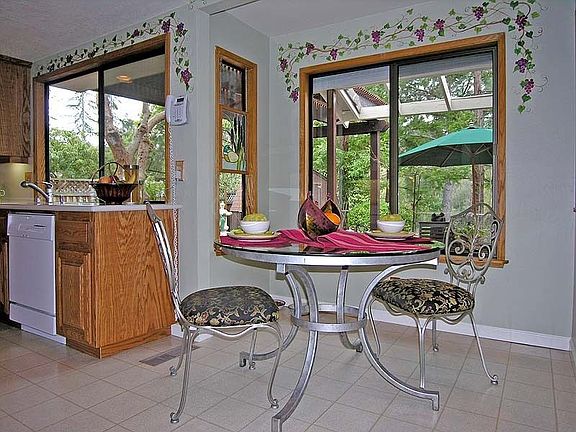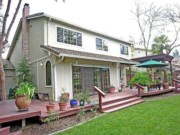Gorgeous home, Expanded family room and nook, extensive built in cabinets,desk and book in family room, new heater and air conditioner. All rooms repainted beautifully, new white baseboards throughout, new carpeting and upgraded pad throughout. Wooden floo9rs in entry, redone kitchen and appliances with Corian counter tops. Star lighting in dining room. New dual pane windows, fireplace with gas log, sliding french doors with french panels. Master bedrooms have huge walk-in closet. The house has all new tile roof and gutters. Behind, an expansive redwood deck, play house with electrical. The backyard has great privacy and a welcoming view of park-like greenbelt.