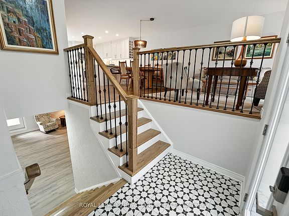 Designed with comfort, elegance, and functionality in mind, this property offers exceptional indoor and outdoor living. Ideally located with easy access to Hwy 401, the hospital, Walmart, Home Depot, and Terry Fox School, and just minutes from downtown. Scenic walking trails, parks along the creek, and the YMCA are all within walking distance. Inside, expansive custom windows allow for plenty of natural light throughout, while elegant hardwood flooring adds warmth. The gourmet kitchen features a peninsula island and abundant cabinetry, designed for entertaining and seamlessly connected to the open-concept dining and living areas. The fully finished basement includes a natural gas fireplace and a walkout to the backyard deck. The spacious deck off the kitchen functions as an extra summer room, perfect for relaxing or entertaining. The exterior offers an attached 1 -car garage with opener, driveway parking for four vehicles, and a lovely, green backyard ideal for enjoying the outdoors while still being minutes from town and Hwy 401. Recent upgrades make this home truly move-in ready. Highlights include a custom kitchen with quartz countertops and waterfall peninsula (2023), renovated bathrooms, refinished hardwood flooring, new stairs and railings, LVP flooring in the basement, new appliances, expanded front patio, new windows, doors, patio door, awning fabric, garage door, water softener, new decks, and a custom closet organizer in the primary suite. Additional improvements include ceramic tile at the front entrance, extra attic insulation.