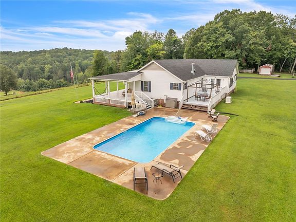 Cozy fireplacePrivate in-ground poolFront country porchSweeping viewsTree-lined backdropJetted tubPowered workshop