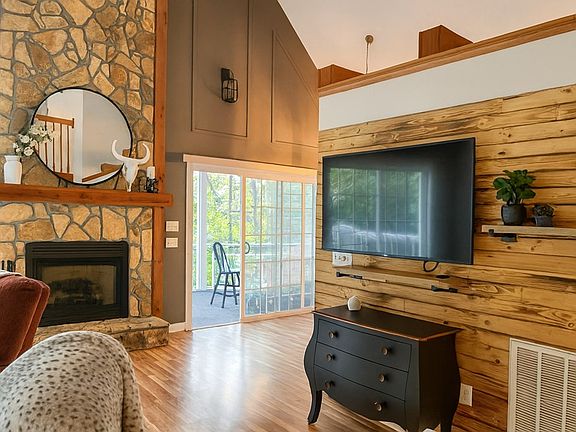 GORGEOUS year around SUNSET mountain views from all main living spaces. This sale includes 4 lots total including the adjacent lot 9 for extra privacy or build another home and the other 2 lots 13 and 14 are across the street so you can control your mountain view. What an incredible investment opportunity! 3 large bedrooms, 3 full baths including 2 en-suites and 1/2 bath in your fully finished basement. Great room features a gas 2 story stone fireplace, sliding glass doors, 2 bedrooms on the main floor and a massive bedroom upstairs. Basement is currently set up as a game room and theater room with windows for natural light and a walk out door straight to the firepit and yard. Heavily wooded for privacy allow for stunning season changes and a Spring full of flowers. METAL roof installed in 2022 and new AC system in 2023. 1 car detached garage, gutters, low HOA fees, Hardie plank exterior, painted in 2020, just MOVE RIGHT IN.