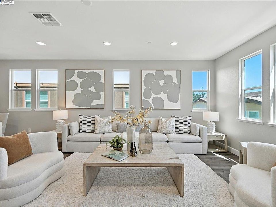 Welcome to 437 Ryan Terrace—an elegant tri-level corner townhome in the heart of San Ramon, a city celebrated for its top-rated schools, family-friendly vibe, and abundant parks. This spacious 3-bedroom + office, 3.5-bath residence blends comfort and functionality with designer finishes throughout. The gourmet kitchen boasts a large quartz island, gas cooktop, stainless steel appliances, and generous cabinetry. Enjoy luxury flooring in the main living areas, brand-new carpet in all bedrooms and hallways, and smart dual-zone climate control. Start your mornings on the private balcony, then retreat upstairs to a serene third level featuring a luxurious primary suite with dual vanities, a custom walk-in closet, and stunning mountain views. Two additional bedrooms share a full bath, while the laundry room offers custom built-ins. The versatile ground-level office (no closet) includes a full bath—ideal as a guest room, workspace, or media lounge. Additional highlights include a tankless water heater, EV charging outlet, and a 2-car side-by-side garage. All this in a quiet, kid-friendly community with easy access to I-680, shopping, and top schools—don’t miss this exceptional opportunity!