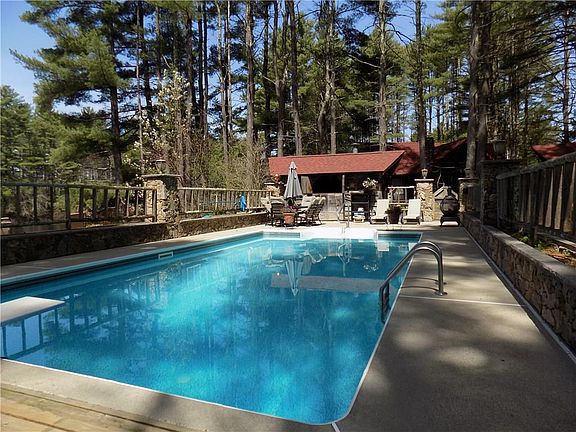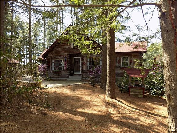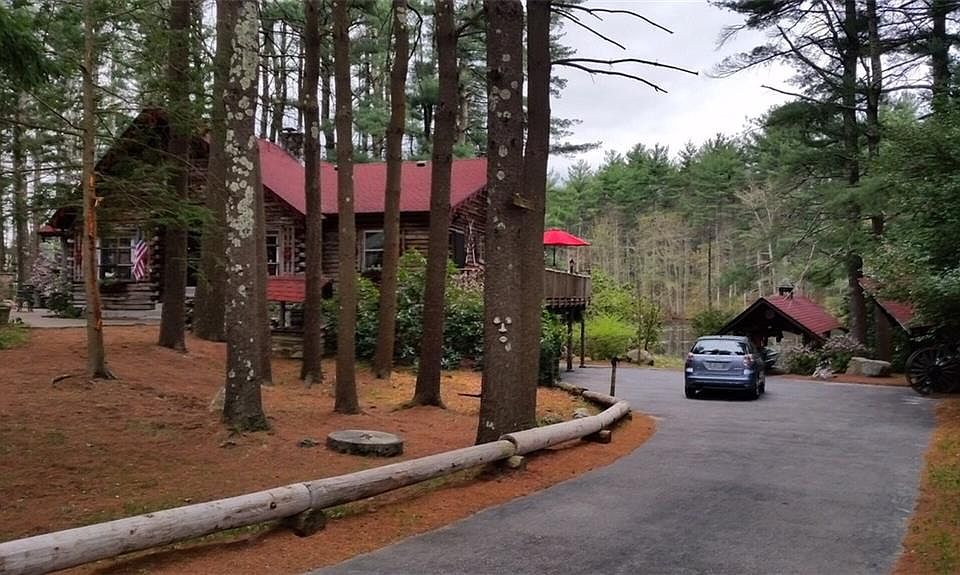 Welcome to Castlewood! A beautiful, mystical, WATERFRONT LOG home nestled in the pines on two acres on the quiet side of Coventry. This is a lifestyle home built to create memories. As you enter this home you are blown away by the Great Room with a vaulted ceiling, lovingly hand planed beams, and a floor to ceiling stone fireplace! The master bedroom is on the main level and looks out over the water. Beautiful hardwoods are throughout the home. Summer? This home offers an incredible custom built heated and glistening pool surrounded by stone walls. It is gorgeous! There is a large deck for relaxing and watching the sun set over the water at the end of the day. A screened-in patio, with an addtional floor to ceiling stone fireplace, sits right outside the great room. Perfect for taking the chill out of the summer night air. Or, you could take a soak in the eight person hot tub! There are several fun out buildings including a scooter shack with a little potbelly stove for heating up that hot chocolate after a bit of ice skating, a forge shack, and a wood shack with a running water wheel! There is a covered bridge for storing your kayaks, canoes, etc. and additional covered bridge style carport for your car (there is also an integrated garage with a workshop). There is something fun and special to see with every turn you take. The home also has many recent updates including a brand new furnace and a 2 1/2 year young roof. From this location you have the Greenway bike bath, Parker Woodlands hiking trails, and access to Johnsons Pond just minutes away! Work in the city? This location is just a 1/2 hr commute through quiet back roads. This is a rare opportunity to own one of Coventry's most unique homes!
