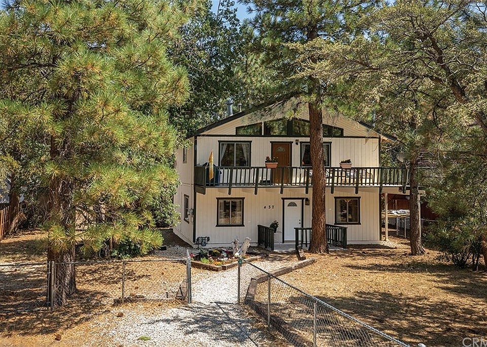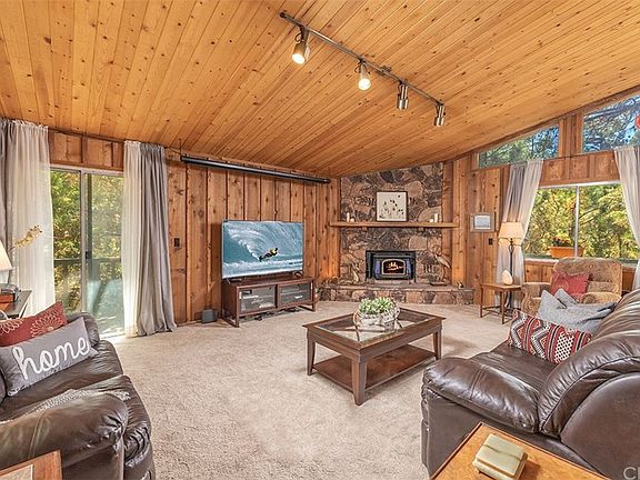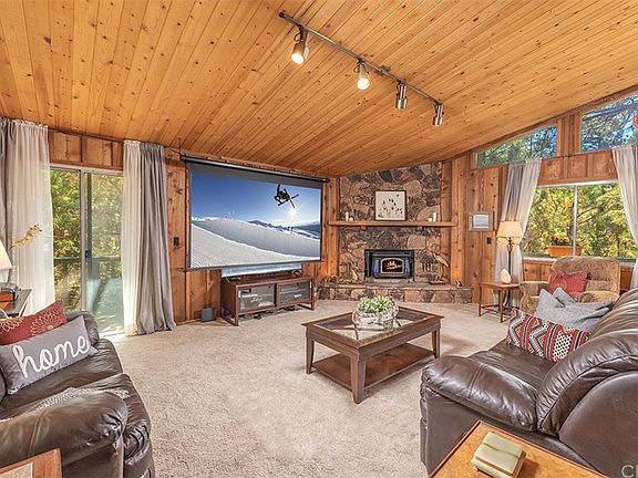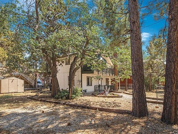Seller reviewing offers & requested no additional showing at this time. Nestled in a lovely treed setting this 3 bdrm, 2 bath home sits on an expansive 7,125 sq ft lot, delivering Mountain Magic-inside & out! Vaulted & beamed ceilings & beautiful interior wood details set this home apart. The spacious living rm has a Wall-of-Windows, stone fireplace w/heat-efficient wood-burning insert PLUS remote control screen & projector for memorable "movie nights!" The kitchen has great storage & opens onto the fantastic wrap-around deck overlooking the fenced yard & natures beauty. The master bedroom has a nice closet & direct ensuite access to a full bath. There is an additional entry to the bathroom for the guest rooms as well. Two guest bdrms w/closets, laundry and a 3/4 Bath at the top of the stairs add convenience for both guests & owners. Offering the possibility to expand or add a garage~great parking for cars~boat~RV. Large storage shed for the toys & tools of Big Bear life.